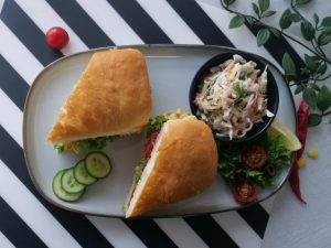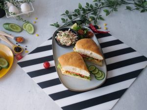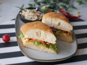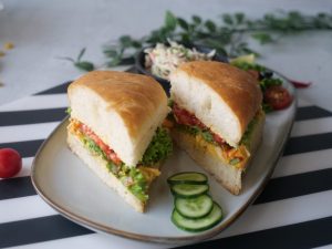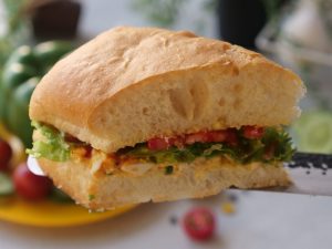 -Add & spread prepared filling,lettuce leaves,tomato slices,tomato ketchup & flip to make a sandwich (makes 2 sandwiches).