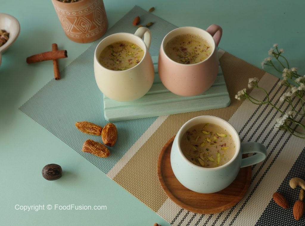 Add pistachios,dry dates,cashew nuts,almonds,green cardamom,cinnamon sticks,nutmeg & roast until fragrant (3-4 minutes) and let it cool.