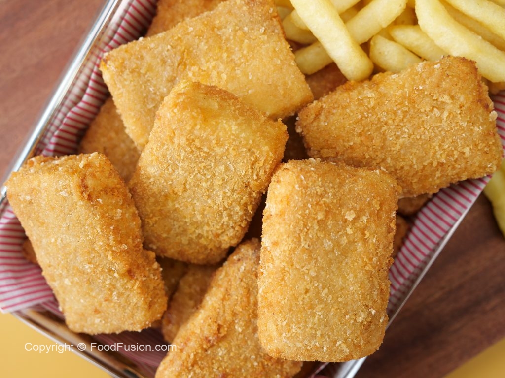 Coat frozen fish nuggets with all-purpose flour than dip into liquid flour mixture & coat with breadcrumbs (makes 26-28).