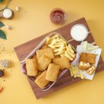 French fries,tomato ketchup & garlic dip ka saath serve karein!