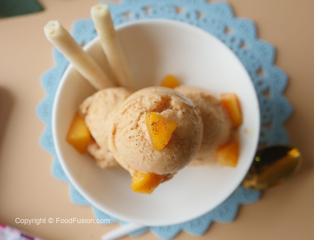 In blender,add frozen peaches,hanged yogurt,brown sugar,cinnamon powder and blend until smooth.