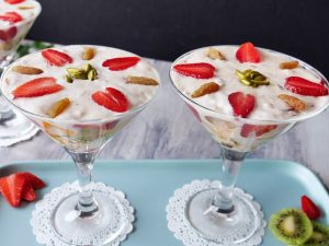 -Add green cardamom powder, pistachios, almonds, mix well & cook until the desired thickness (3-4) rabri doodh is ready, let it cool completely.