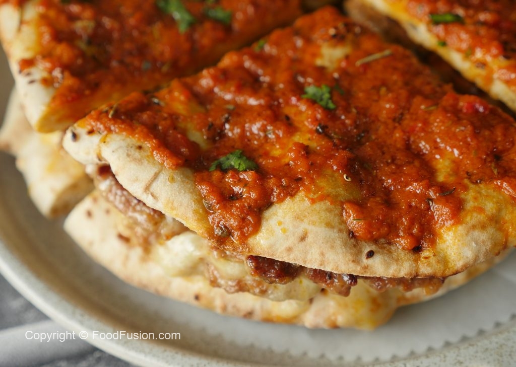 Mozzarella cheese,cheddar cheese,paprika powder,pyaz slices,tamatar,hara dhania aur lemon juice dal dein aur upper sa ek aur kabab rakh ker evenly pheela lein phir flat surface per flip ker lein (makes 2).