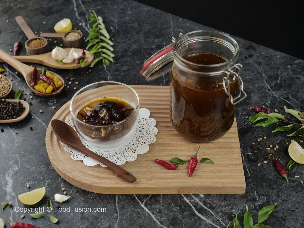 In remining oil,add fenugreek seeds,cumin seeds,fennel seeds,mustard seeds,yellow mustard seeds, black peppercorns,nigella seeds,garlic,dried red chillies,curry leaves,mix well and cook on medium flame for 2 minutes.