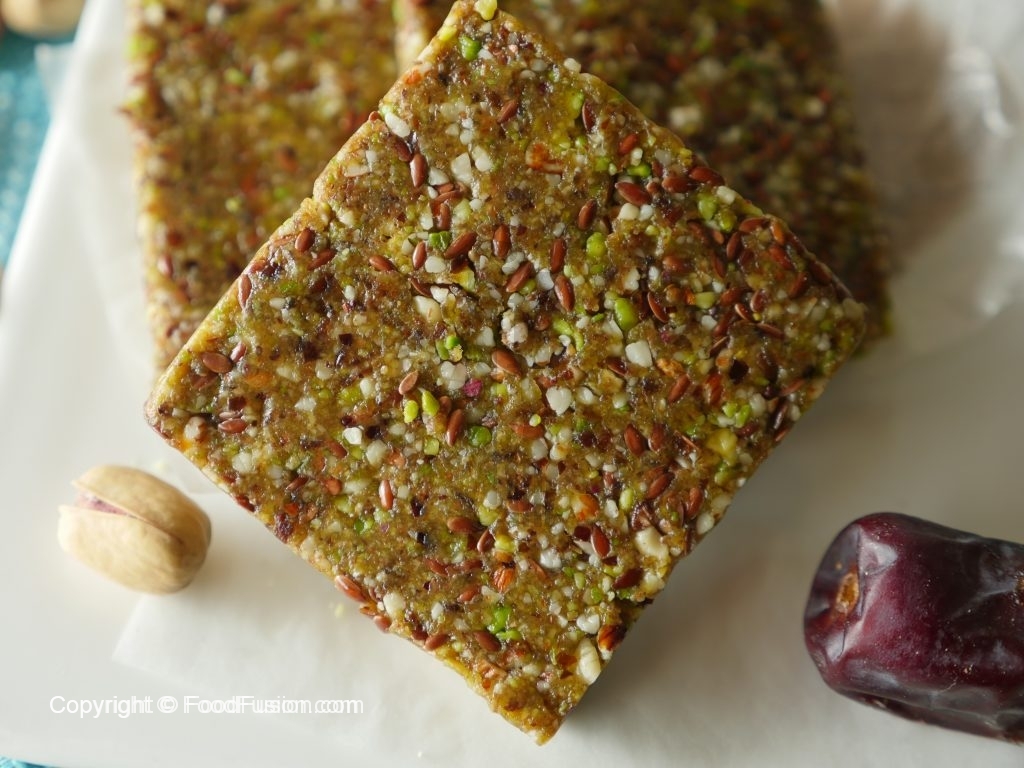 In chopper,add almonds,pistachio,flax seeds,coconut oil,dates and chop until well combined.