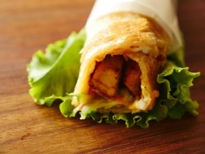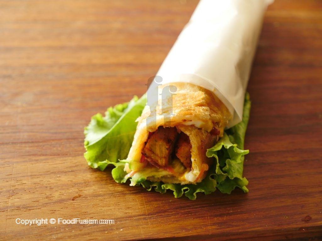 On fried paratha,add mayonnaise,tomato ketchup,mustard paste,cucumber,carrot,fried chicken chunks and wrap & serve.
