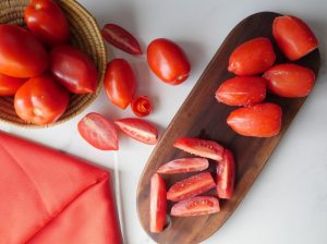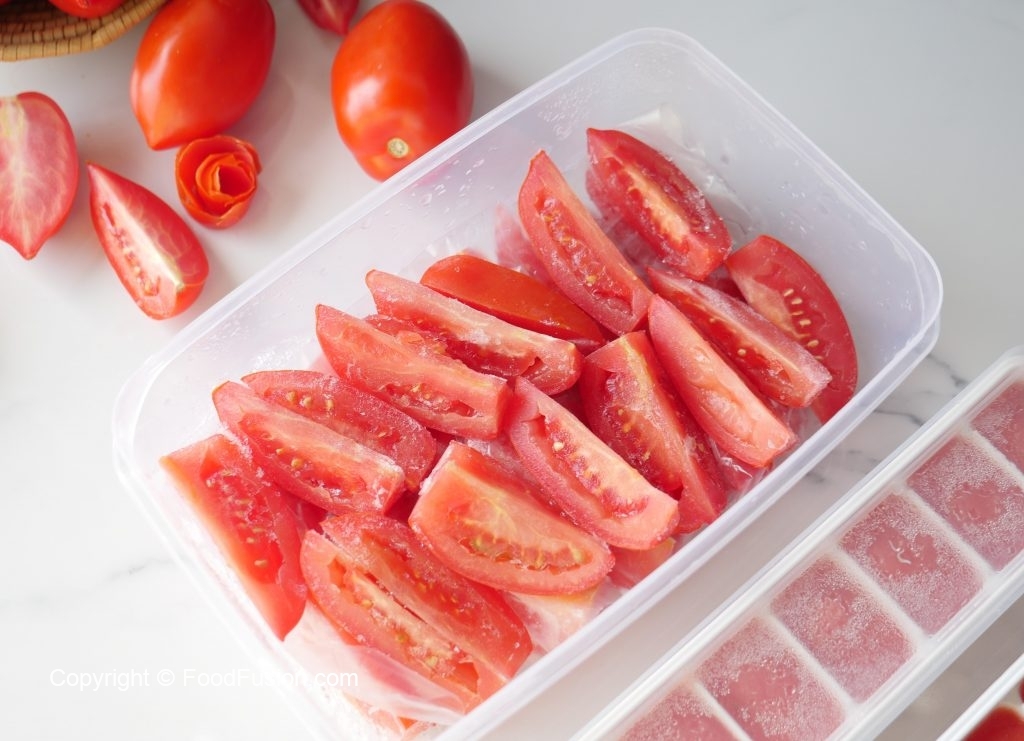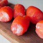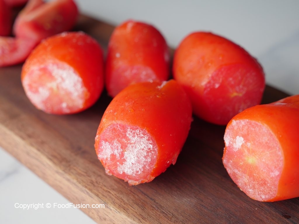 Dip freeze tomatoes in water for 5-10 seconds to thaw skin & remove its skin.