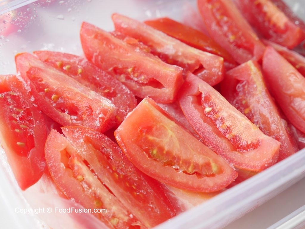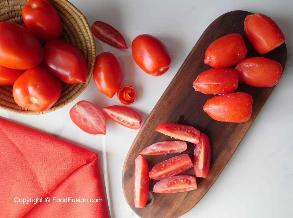 In boiling water,add tomatoes,blanch for 4-5 minutes then strain and let it rest in iced cold water for 5 minutes.