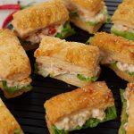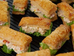 -Add tomato ketchup on both sides,place salad leaf on one side,add prepared filling & flip the other side of puff pastry biscuit & serve (makes 18-20).