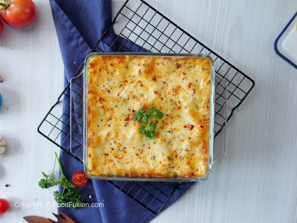 -In a (7.5 X 7.5 inch) oven safe baking dish,add & spread red chicken sauce,lasagna sheets,white sauce,red chicken sauce,cheddar cheese,mozzarella cheese,lasagna sheets,white sauce,red chicken sauce,cheddar cheese, mozzarella cheese,lasagna sheets,white sauce,cheddar cheese,mozzarella cheese,dried oregano & red chilli crushed.
