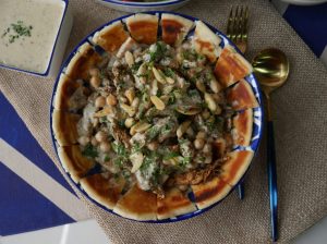 In serving bowl,add chickpeas,pita bread,cooked & shredded chicken,fried almonds and drizzle prepared yogurt sauce and garnish with fresh parsley & serve!