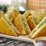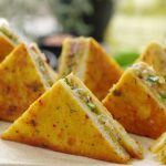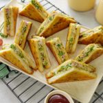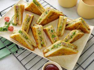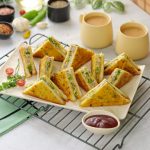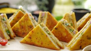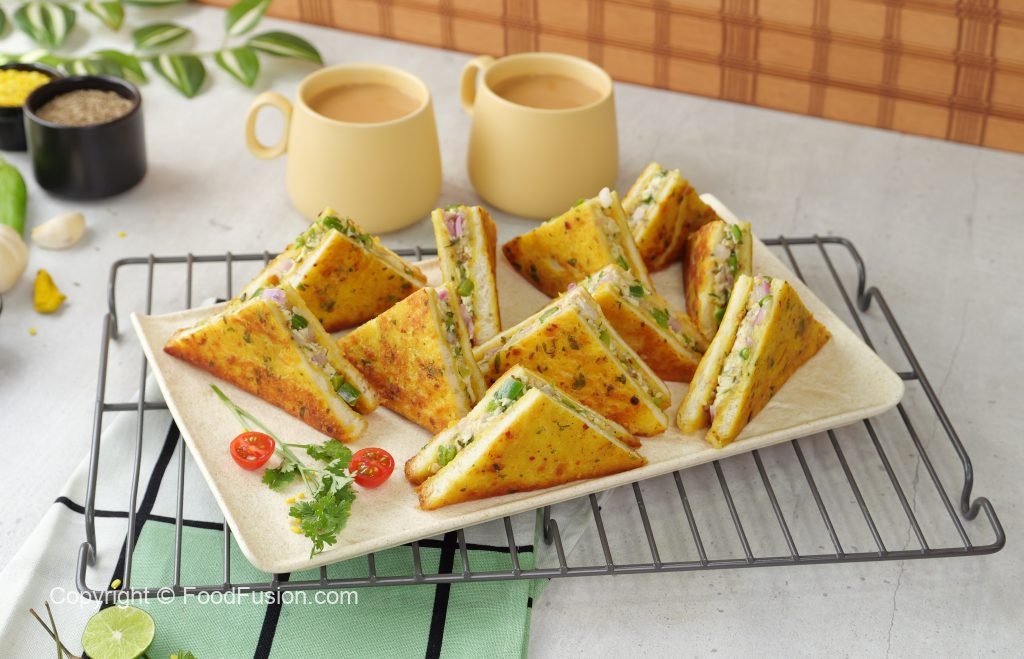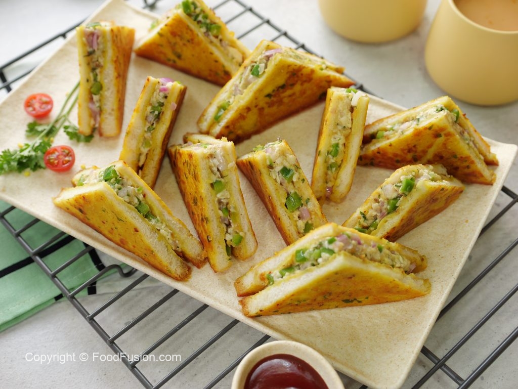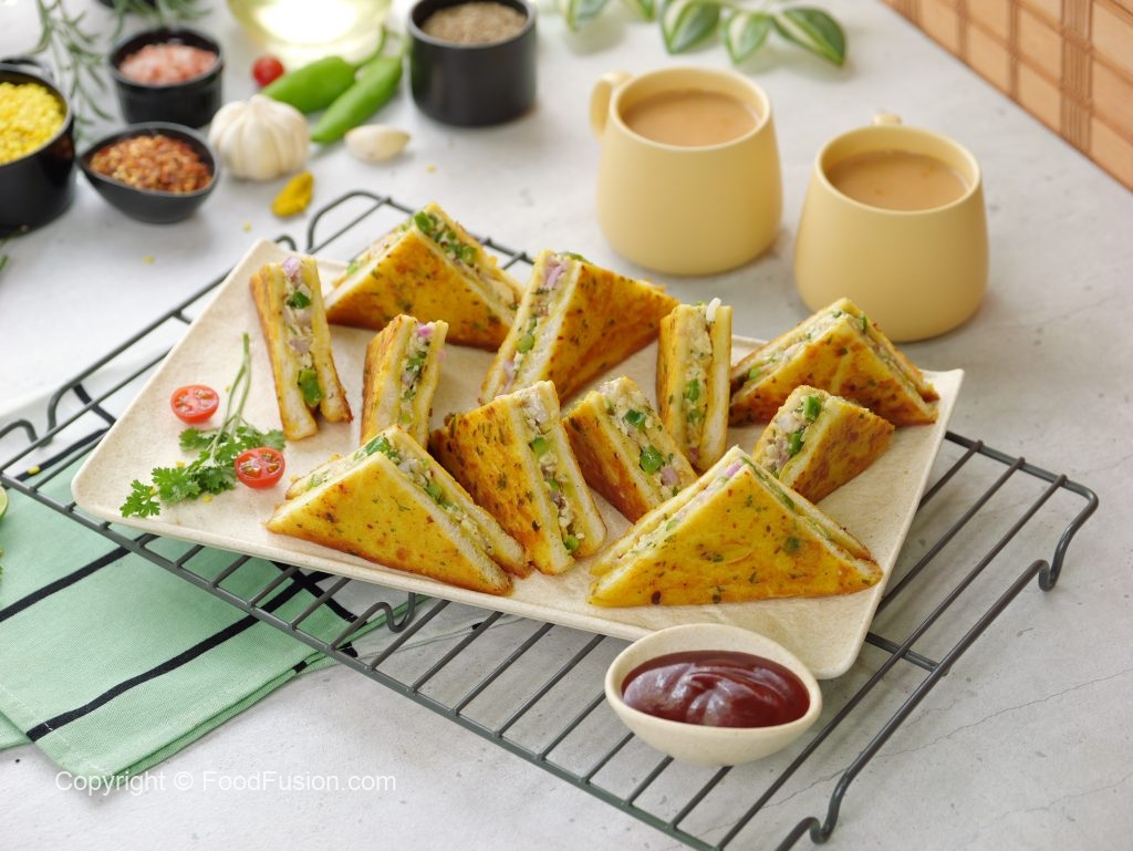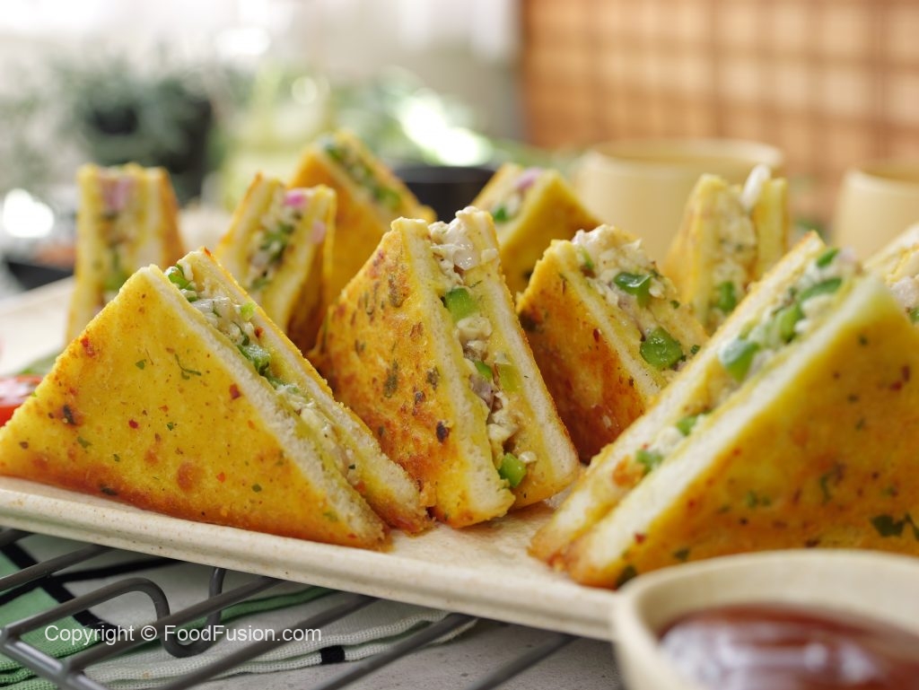 -Dip two bread slices in prepared batter & fry on medium flame until golden then flip,add & spread prepared filling on one bread slice,flip the other slice on it & fry from both sides until cheese melts.