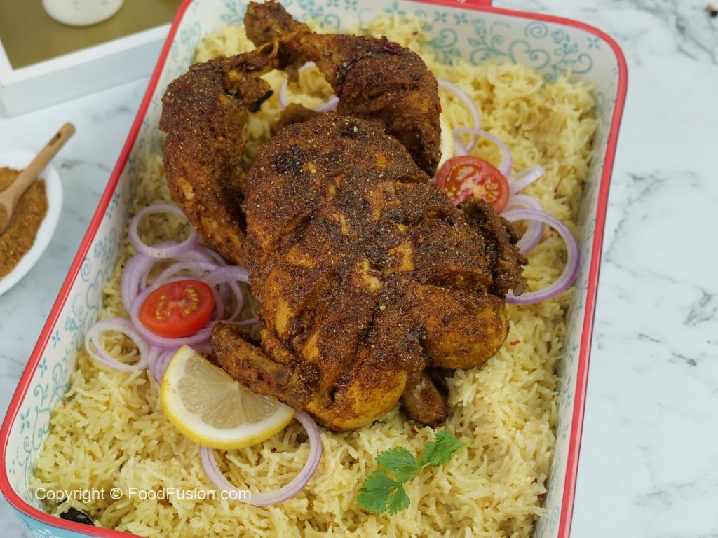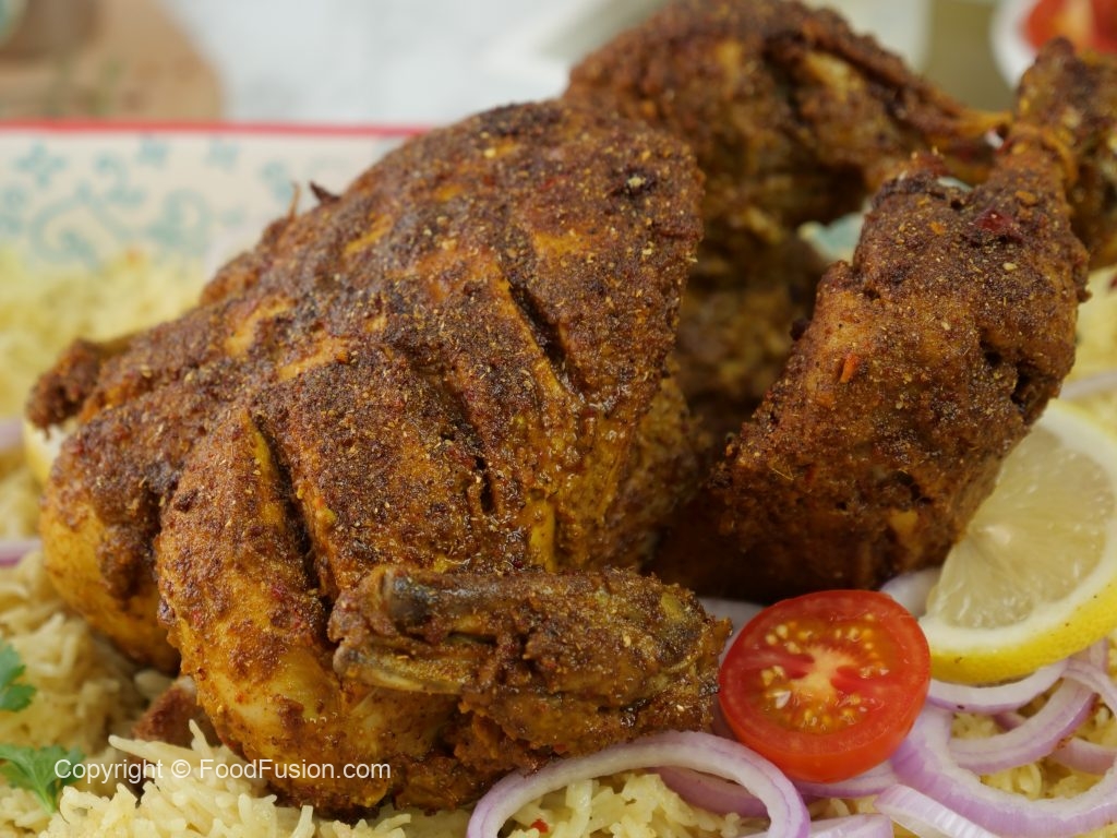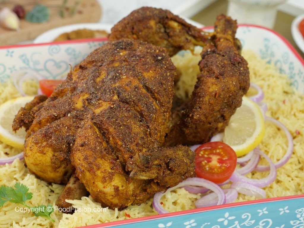 -Chulha bund ker dein aur whole chicken per tayyar spice mix chirak dein.