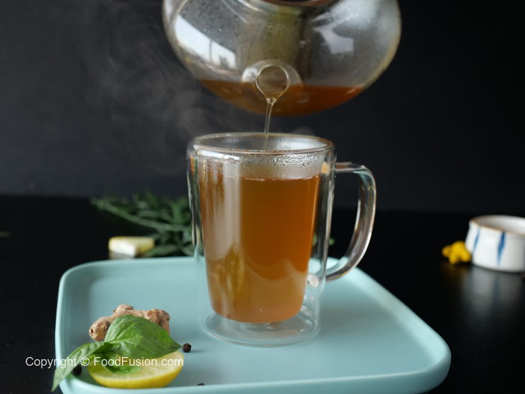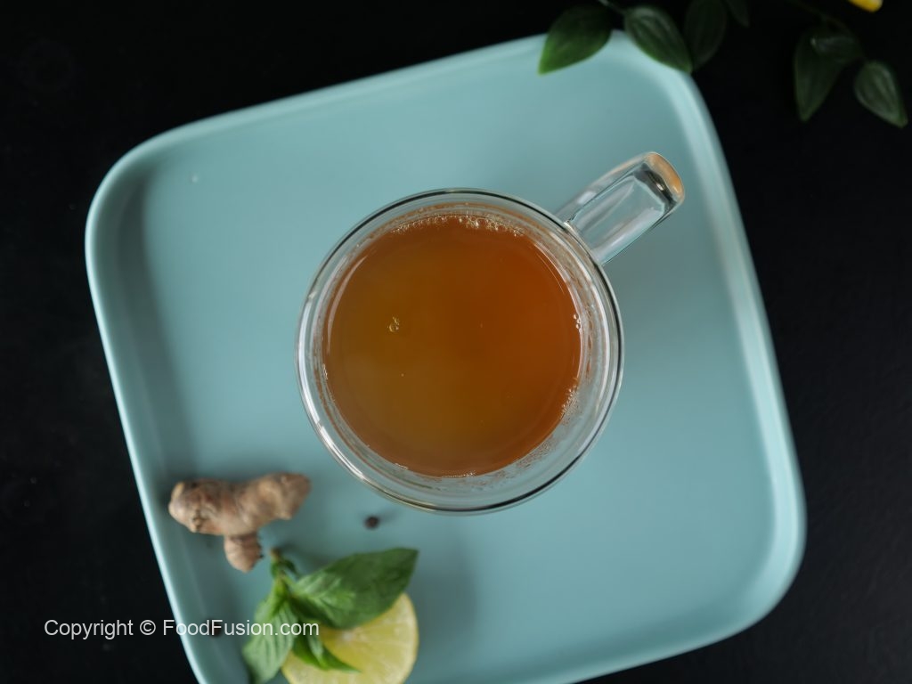 -Kettel mein pani dal ker strainer ya malmal ka kapra rakh dein,taza haldi,laung,kali mirch crushed aur basil leaves dal dein aur ubal anay dein.