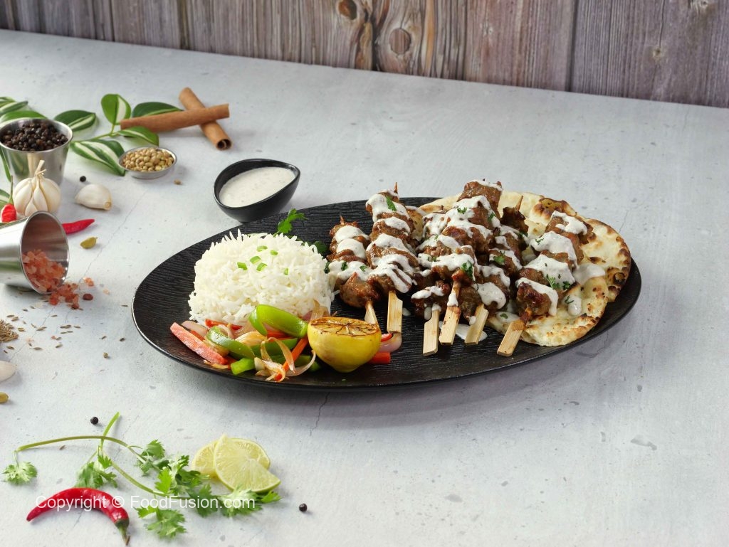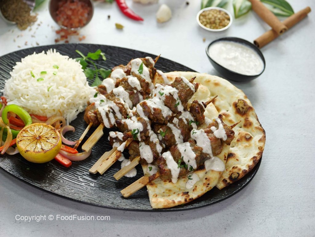 -Thread marinated mutton boti in wooden skewers.