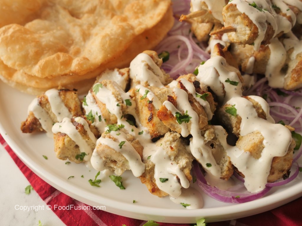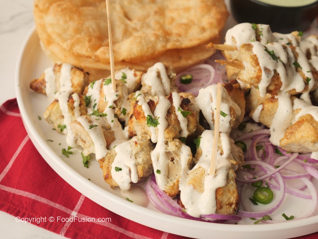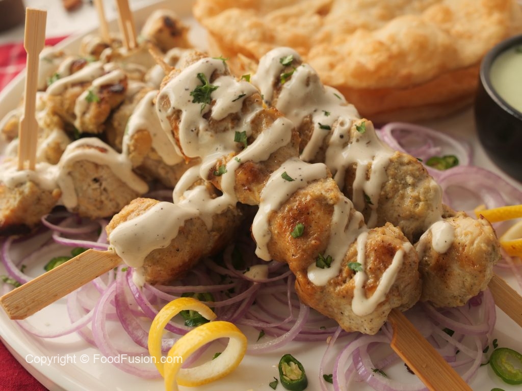 Amazing Malai Tikka Boti Bites with a creamy garlic sauce to upgrade the taste. #HappyCookingToYou #FoodFusion #OlpersCream