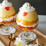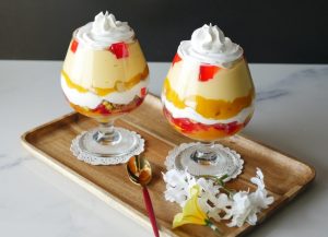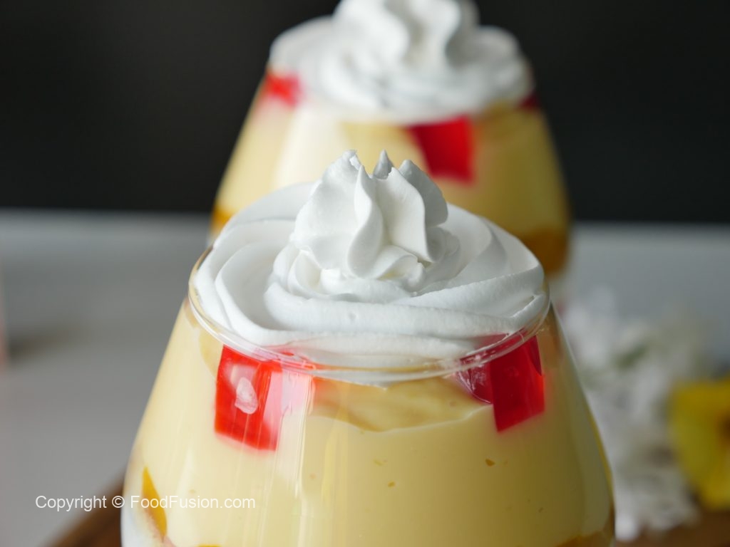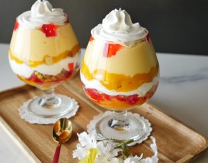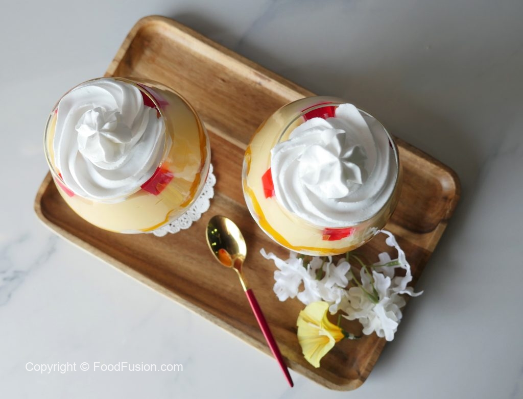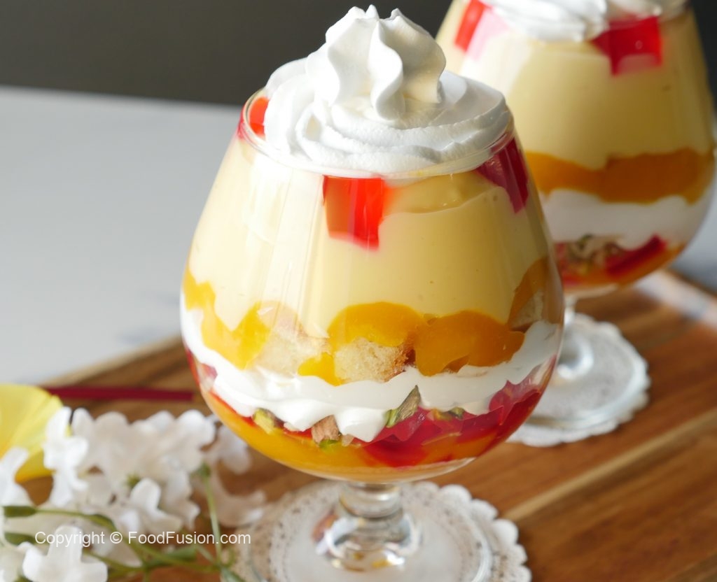In serving cup,add mango puree,red jelly cubes,pistachios & almonds,whipped cream,plain cake cubes,mango puree,prepared custard,red jelly cubes and garnish with whipped cream.
