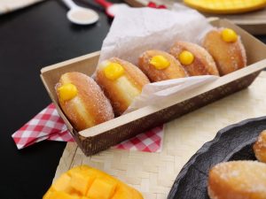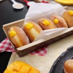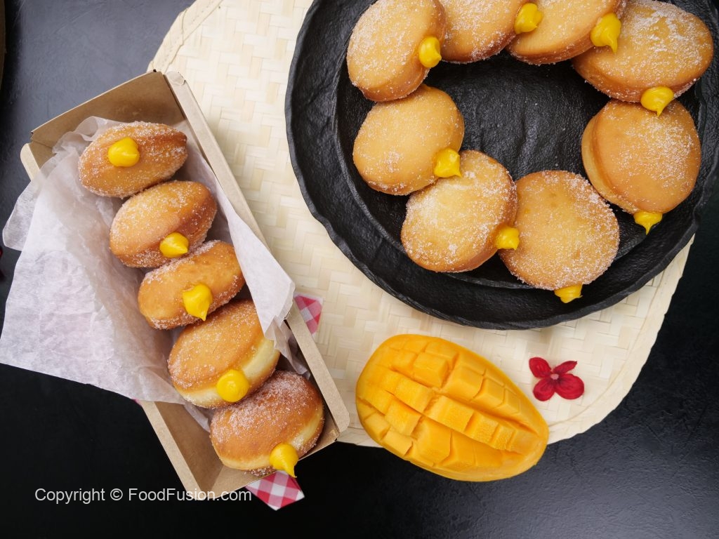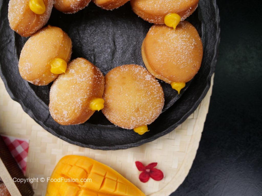 -Fit a piping bag,fill with prepared mango curd into each donut & serve! (Makes 10-12)