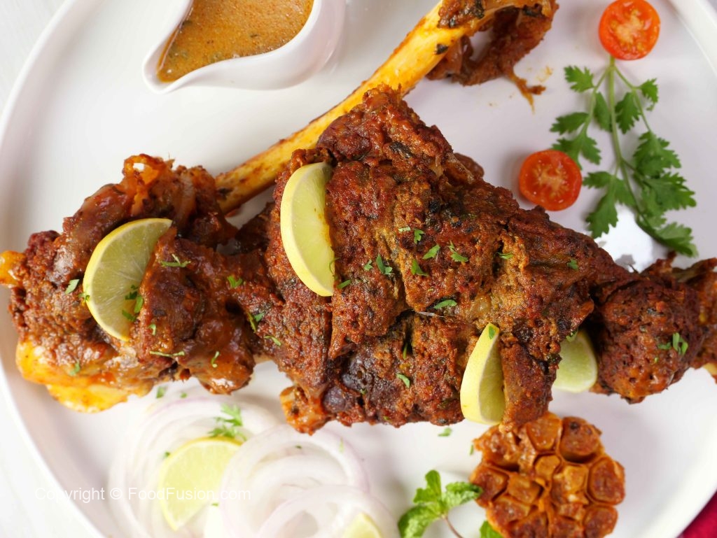 -In pressure cooker,add onions,garlic,marinated mutton leg,fresh coriander,mint leaves,water & garlic bulb,cover & pressure cook on medium flame for 1 hour.