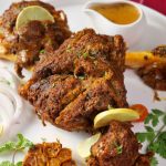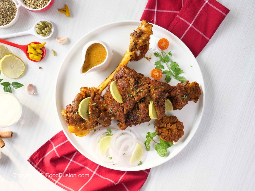 -In a dish,place mutton leg,add raw papaya paste,ginger garlic paste,pink salt,lemon juice & rub well on both sides,cover with cling film & marinate for 30 minutes.