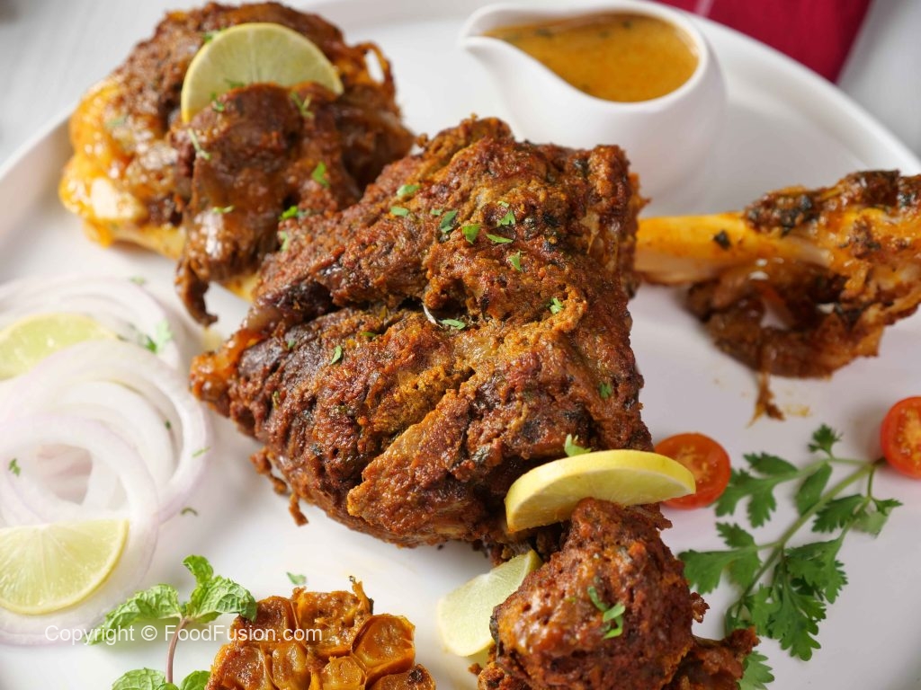 -On marinated leg,add prepared marinade & rub evenly,cover with cling film & marinate for 2 hours in refrigerator.
