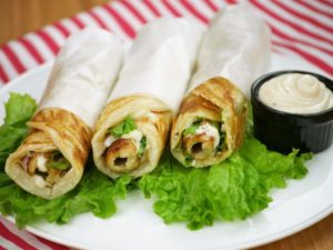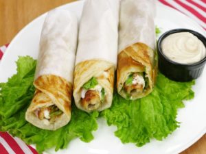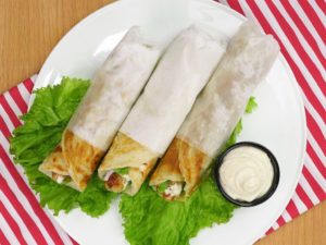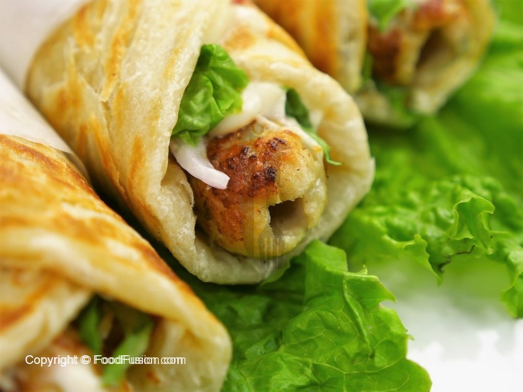 Place dawn bread paratha,add mayo garlic sauce,chicken cheese seekh kabab,onion slices,salad leaves and mayo garlic sauce,warp and serve.