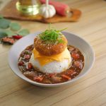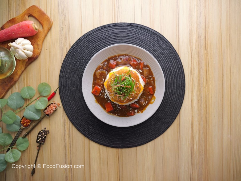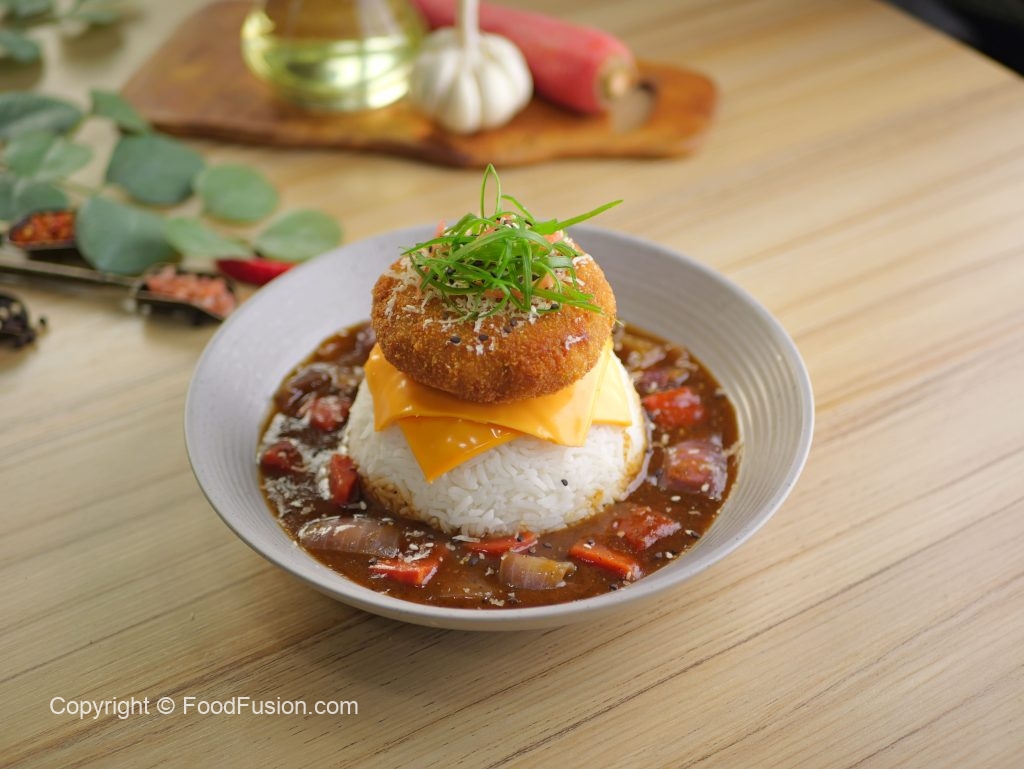 -In a serving platter, add boiled rice, prepared sauce, cheese slice, prepared menchi katsu, & garnish with spring onion, sesame seeds then serve!