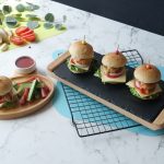 -Cut smini burger buns from center,add & spread prepared burger sauce,lettuce leaf,cheese slice,tomato slice,onion rings,fried chicken nugget,cucumber slices,tomato ketchup,burger sauce and top with another mini bun to make a burger (makes 8-10).