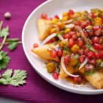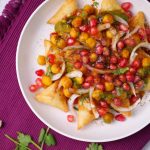 -In a serving plate,add mini aloo samosa,cooked chickpeas,lemon juice,gur imli ki chutney,green chutney,onion,pomegranate,chaat masala,fresh coriander & serve!