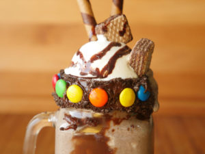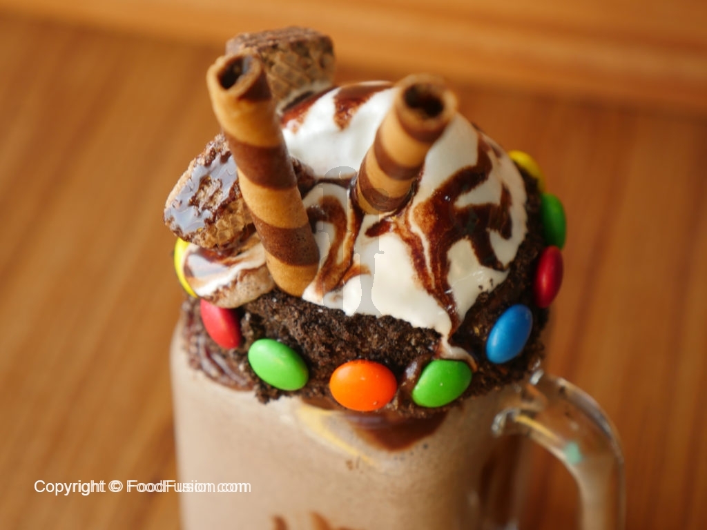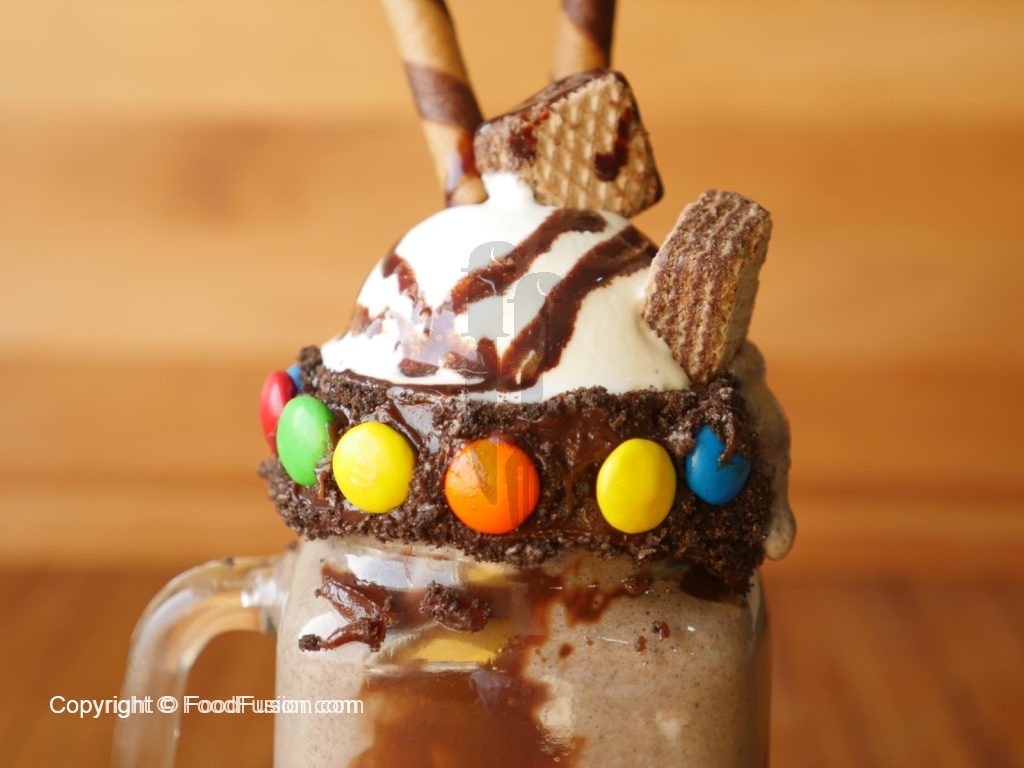 Decorate glass with coffee ganache,brownie crumbs,bunties,pour oreo & coffe shake,add vanilla ice-cream and garnish with wafer sticks and chocolate sauce.