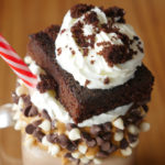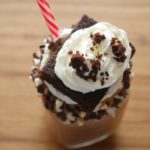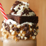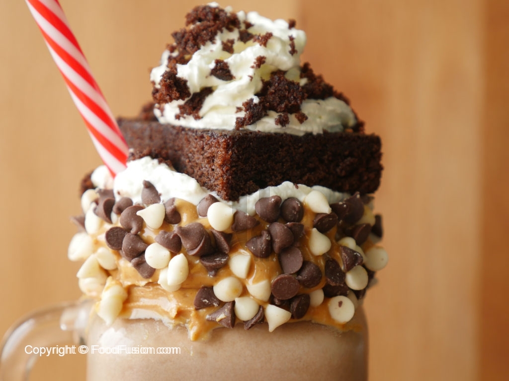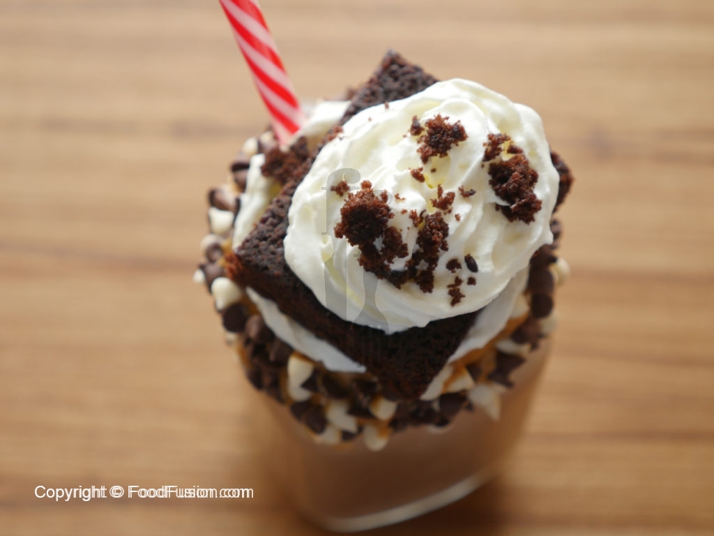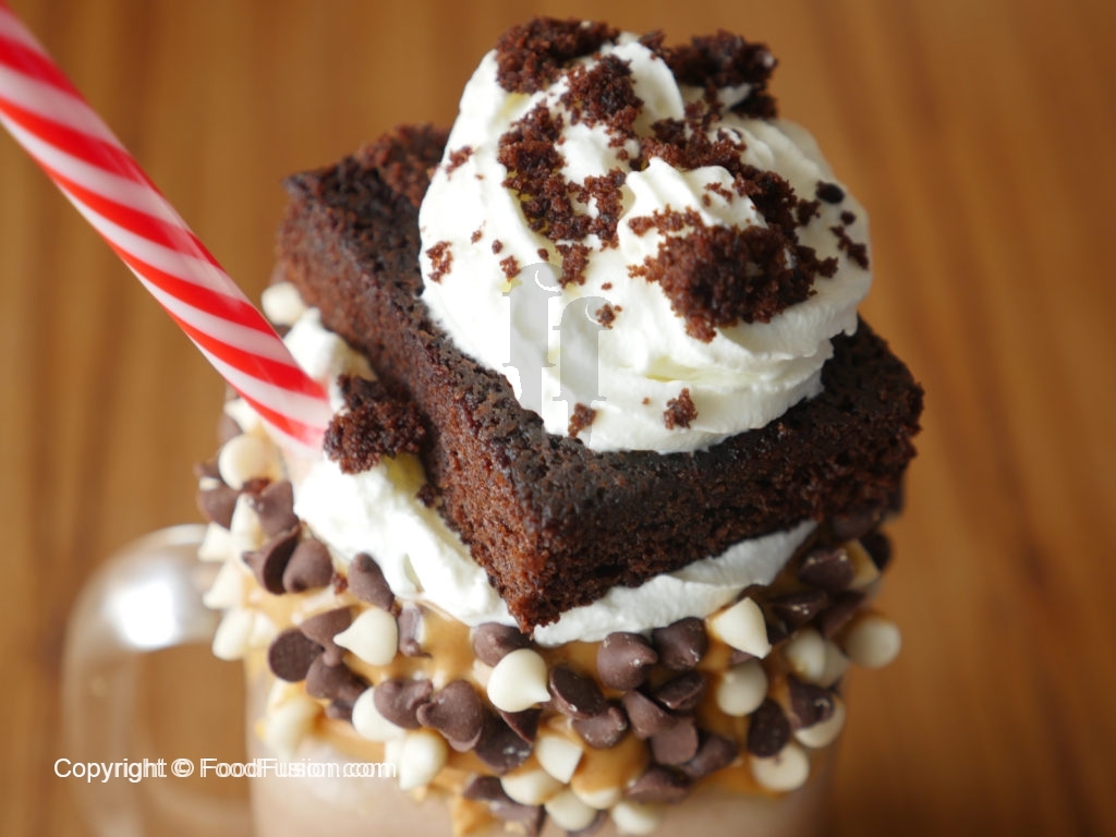 Decorate glass with peanut butter,white and black chocolate chips,pour brownie & peanut butter shake,add chocolate ice-cream,whip cream,brownie and garnish with whip cream.