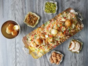 Garnish with fried khoya,fried dry nuts,gulab janum,cham cham & serve.