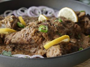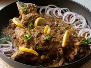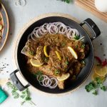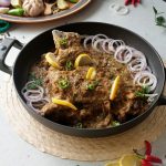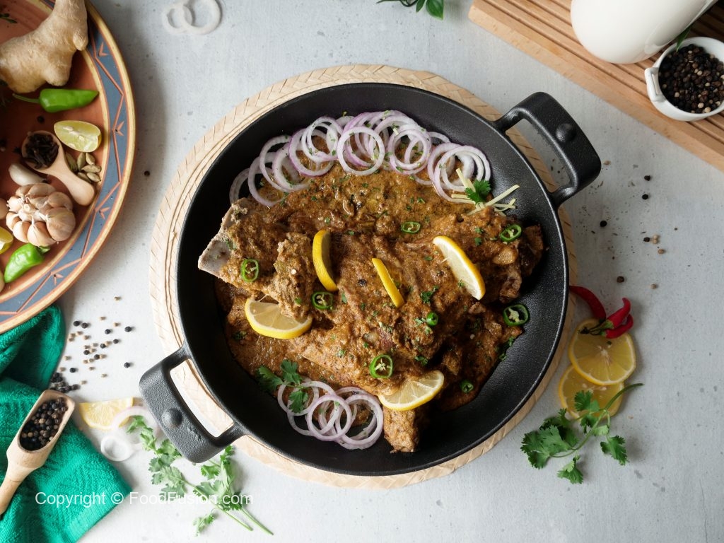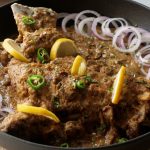 Fried mutton leg/dasti dal ker upper sa gravy dal dein aur dhak ker halki ancch per gul janay tak paka lein (1 & ½ hour) & bech bech mein rotate & flip ker lein.