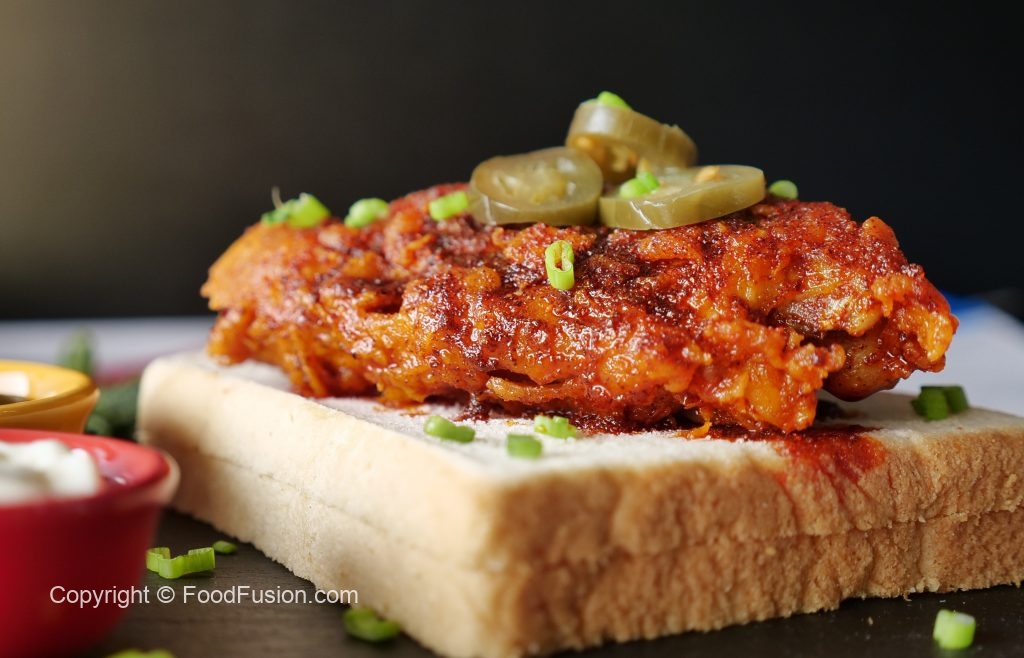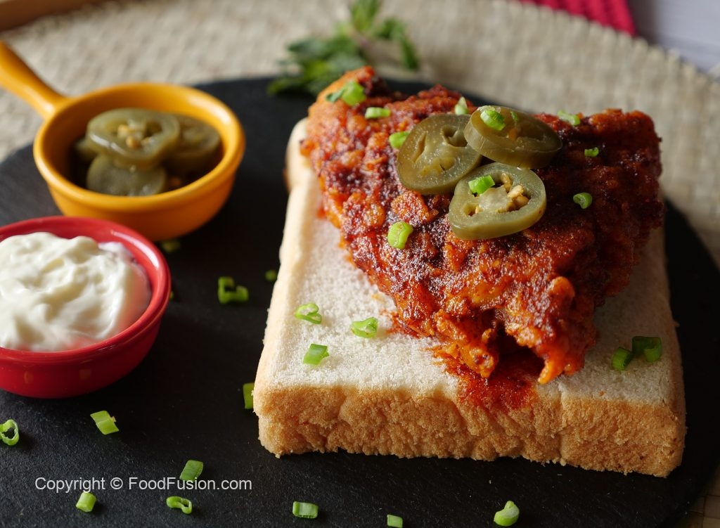 On bread slices,place fried chicken piece,jalapenos slice,sprinkle green onion leaves & serve!