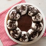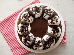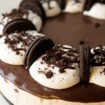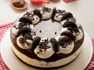 Remove springform pan and decorate with whipped cream,oreo biscuits,melted chocolate & crumbled biscuit.