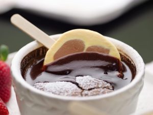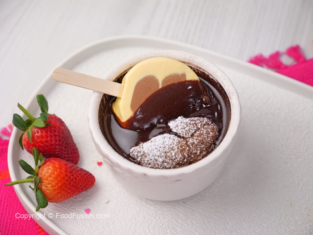 -Pour prepared batter in ramekins & add 1 tbs of prepared chocolate ganache inside the batter,cover with cling film & can be stored in freezer for up to 1 month,just thaw for 10 minutes before baking.