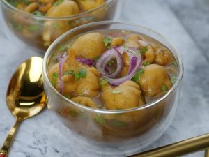 -In blender jug,add garlic,green chillies,mint leaves,fresh coriander,tamarind pulp,salt,dried ginger powder,chaat masala,black salt,cumin seeds,water and blend well then strain well with the help of strainer.
