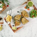 -On bread slice,add & spread prepared pesto sauce,add baby spinach,tomato slices,cheddar & mozzarella cheese,chicken fillet,cheddar & mozzarella cheese,pesto sauce & cover with another bread slice & grill for a minute until cheese melts (makes 3).