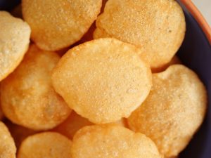 -In a wok,heat cooking oil (180C-200C) & fry on medium flame until golden & crispy (nudge or press down so that puris puff up) then strain on a net strainer & allow gol gappa to air dry for 1-2 hours at room temperature (makes 55-60).