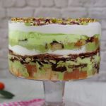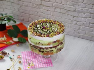 -In a trifle bowl,add plain cake,sugar syrup,chocolate syrup,prepared pistachio sauce,dried rose petals, pistachios,almonds,pistachio flavour & spread evenly.