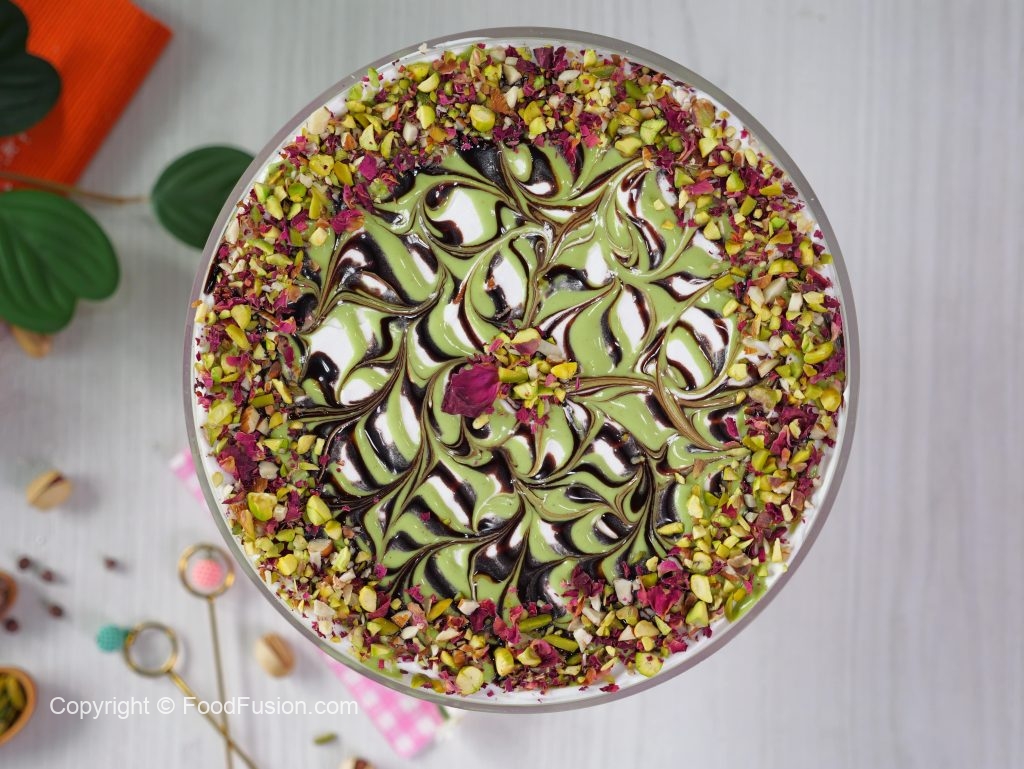 -Add chocolate syrup,whipped cream,pistachio sauce,plain cake,sugar syrup,chocolate syrup,dried petals,pistachios,almonds,pistachio flavor,spread evenly & freeze for 3-4 hours.