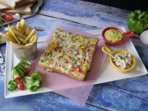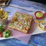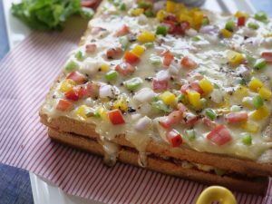 On bread slices,add vegetable & cheese filling,sprinkle dried oregano & red chilli crushed on top.
