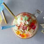 In serving glass,add falooda sev,basil seeds,lal sharbat,prepared rabri milk,yellow jelly,red jelly,pistachio ice cream scoop,falooda sev,basil seeds,pineapple chunks,red jelly,yellow jelly,lal sharbat,almonds, pistachios & serve!