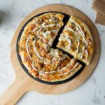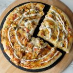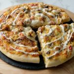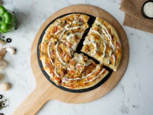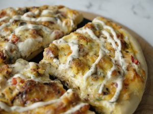 Pizza ko oven sa nikal lein aur ranch sauce ko drizzle ker lein phir slices mein cut lein & serve karein!