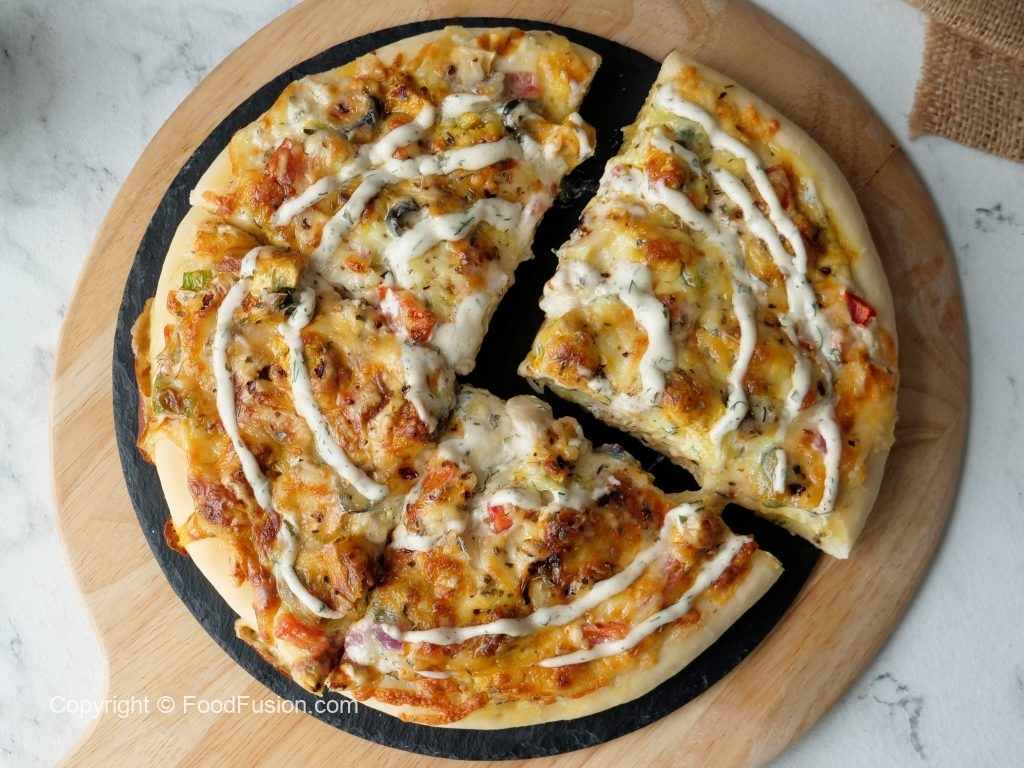 Ranch sauce 3-4 tbs dal ker pheela lein,cheddar cheese,mozzarella cheese,cooked chicken,shimla mirch,pyaz, tamatar,mushrooms,black olives,black olives,cheddar cheese,mozzarella cheese,dried oregano aur lal mirch crushed dal dein (makes 3 medium Pizzas).