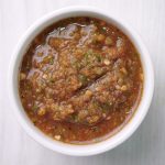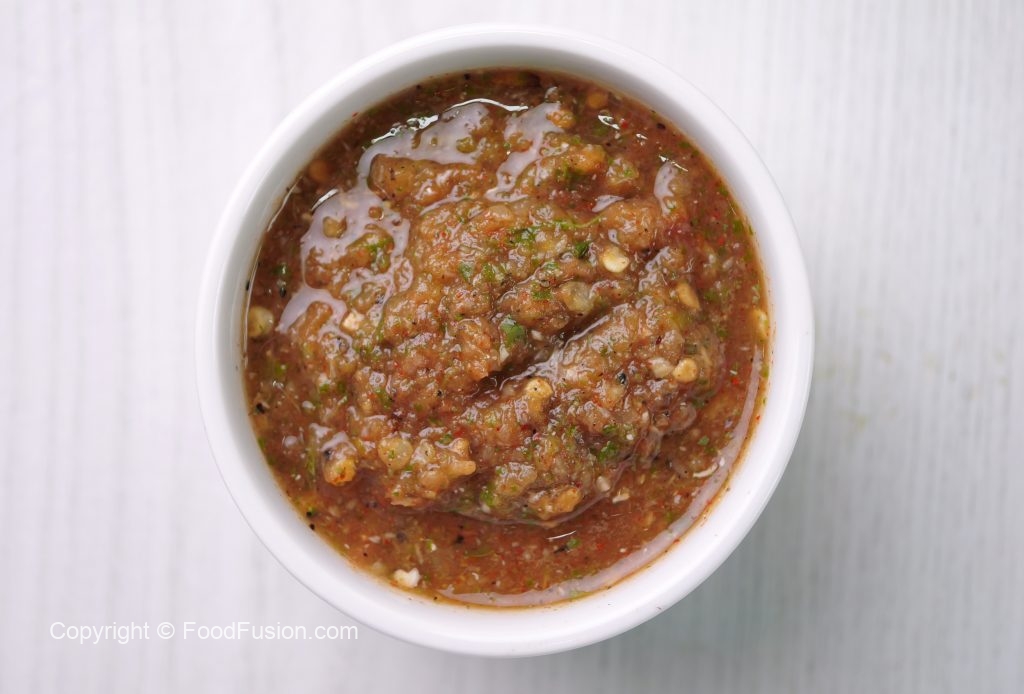-In a mortal & pestle,add roasted garlic,jalapeno,onion,fresh coriander,pink salt,black pepper crushed & crush well.