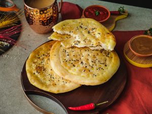 Brush on each naan and sprinkle black & white sesame seeds on top.