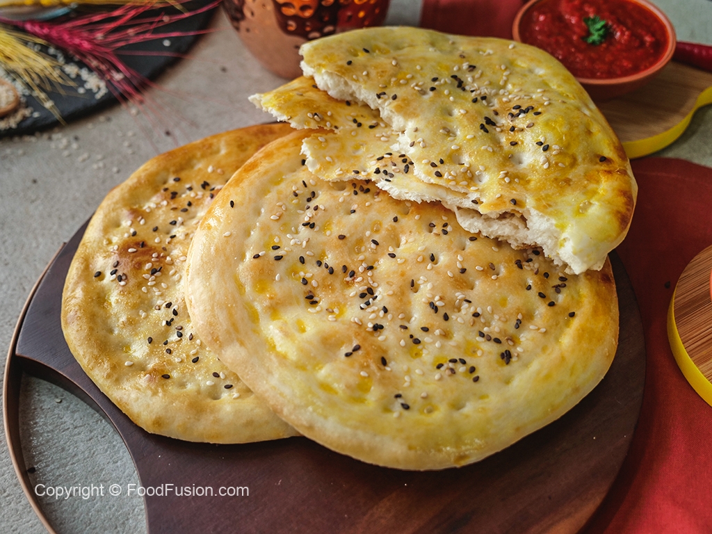 Brush ki madad sa naan per laga lein aur kalay & safed til chirak dein (makes 4).