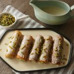 Serving dish mein bread rolls ups rakh dein aur neem garam doodh dal dein.