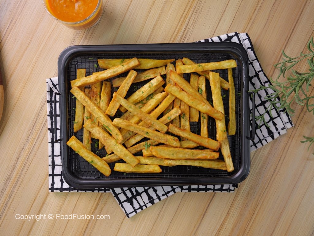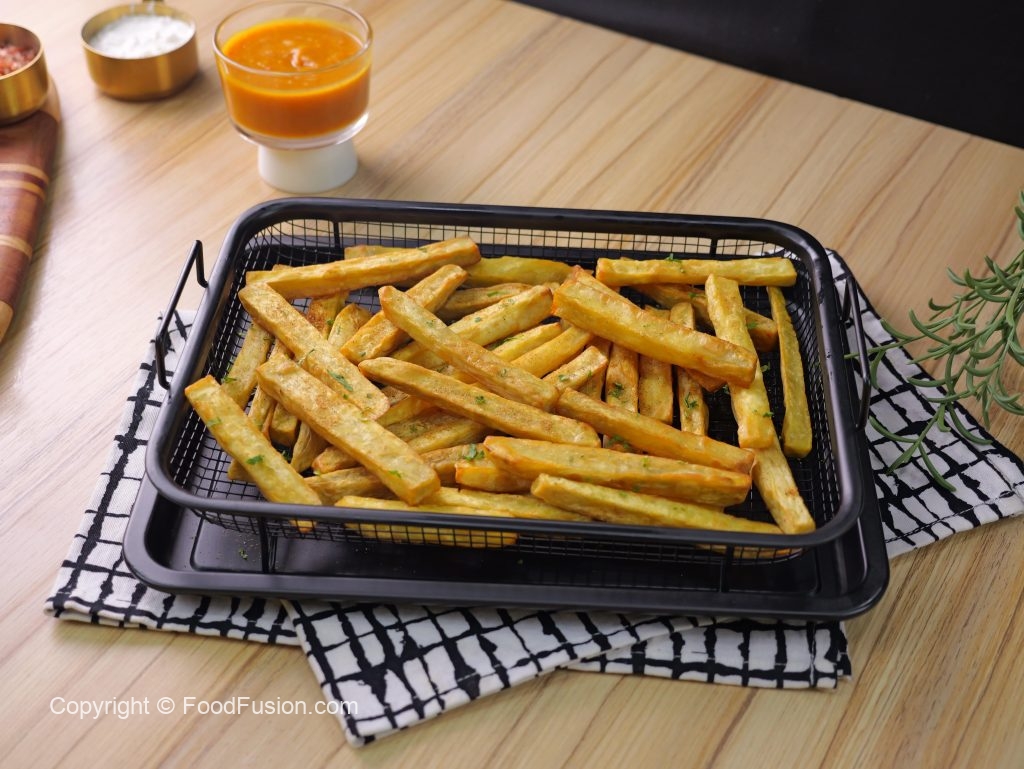 -Ek tray par kitchen cloth bicha den, fries ko single layer mein phela den, achi tarah pat dry kar len, phir kitchen cloth hata den.